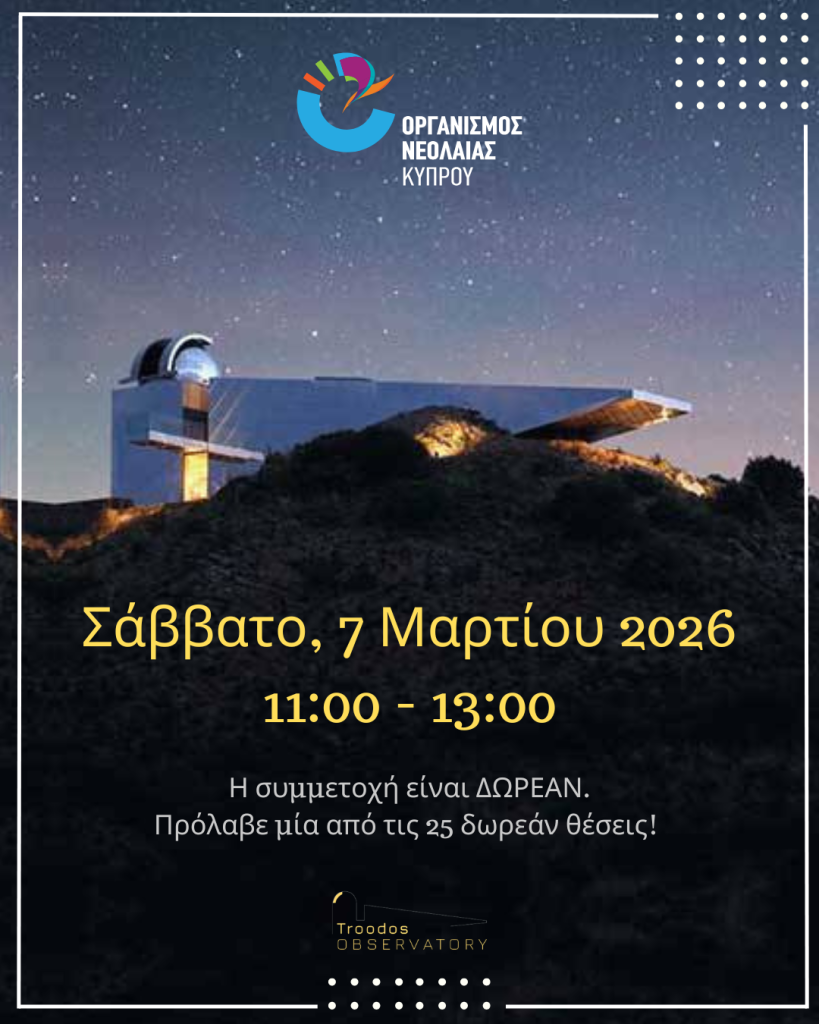 Το Σάββατο 7 Μαρτίου, από τις 11:00 μέχρι τις 13:00, ανεβαίνουμε ξανά στο Αστεροσκοπείο Τροόδους για να ανακαλύψουμε μαζί τον συναρπαστικό κόσμο της αστρονομίας!